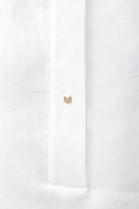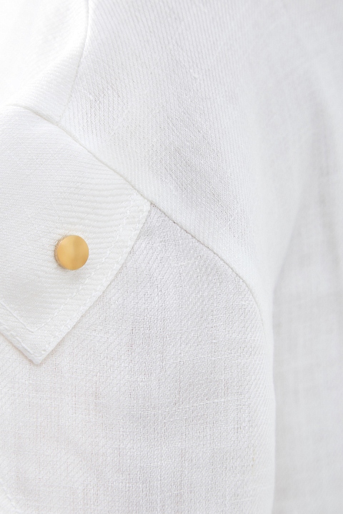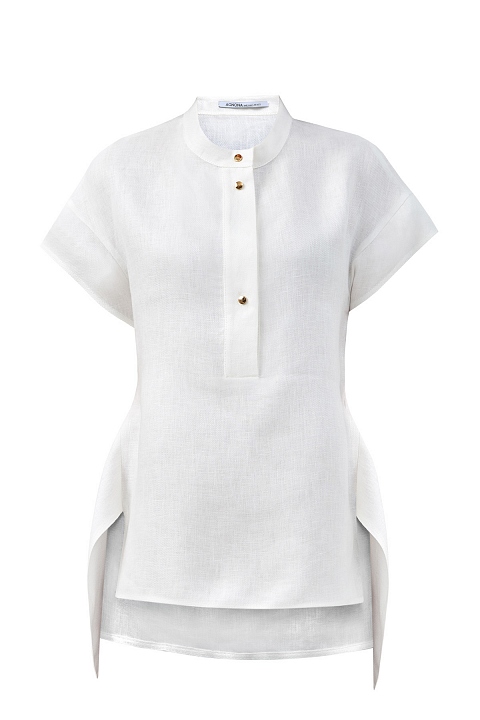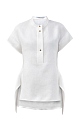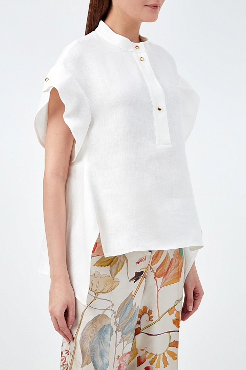 Воздушная женская блуза от Agnona полностью выполнена из льняной ткани диагонального плетения. Природный белый оттенок придает образу легкость и подчеркивает структуру натурального материала. Короткие цельнокроеные рукава с воздушными оборками дополнены асимметричным нижним краем с боковыми разрезами, создавая аутфит в присущем бренду стиле спортшик. Элегантный воротник-стойка завершает дизайн. Сделано в Италии.