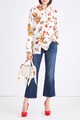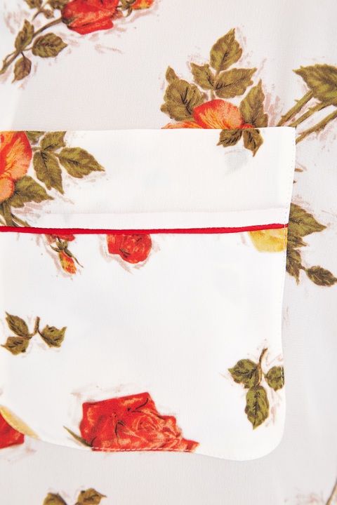 Стильная женская блуза свободного кроя из весенне-летней коллекции Alexander McQueen выполнена из струящегося шелка в деликатном оттенке слоновой кости, который подчеркнут набивным принтом с изображением роз в натуральных оранжево-красных и зеленых тонах. Модель в актуальном пижамном стиле, который выражен в расклешенных рукавах, закругленных линиях отложного воротника, а также окантовкой кромок тонкой тесьмой алого тона. Изделие дополнено аутентичной застежкой на пуговицы и накладным нагрудным карманом. Сделано в Италии.