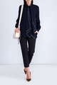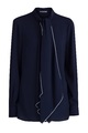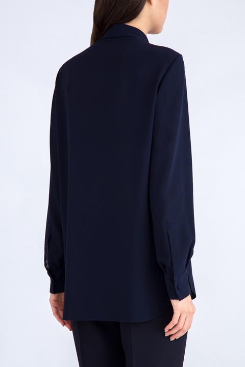 Лаконичная женская блуза из коллекции Alexander McQueen, созданная из легкого струящегося шелка глубокого синего цвета, подчеркнутого окантовкой некоторых деталей контрастными нитями. Модель с длинными рукавами и изящным воротом-аскот с длинными струящимися концами. Сделано в Италии.