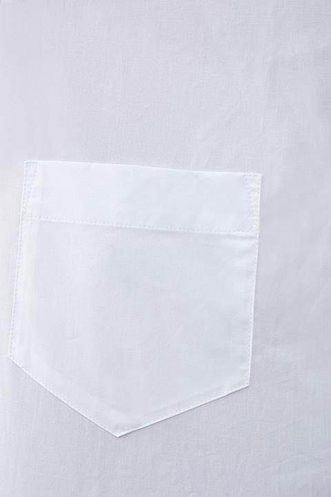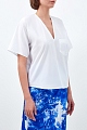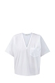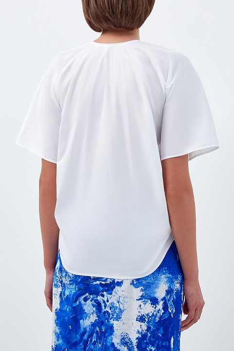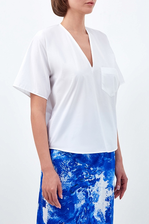 Воздушная блуза от Alexander Terekhov выполнена из плотного хлопка в белом цвете. Свободный крой с цельнокроеными рукавами обеспечивает свободу движений. Фирменную элегантность модели придает V-образный вырез декольте. Детали: нагрудный карман, асимметричные нижние кромки.