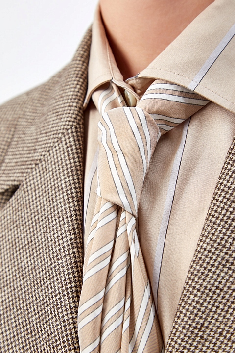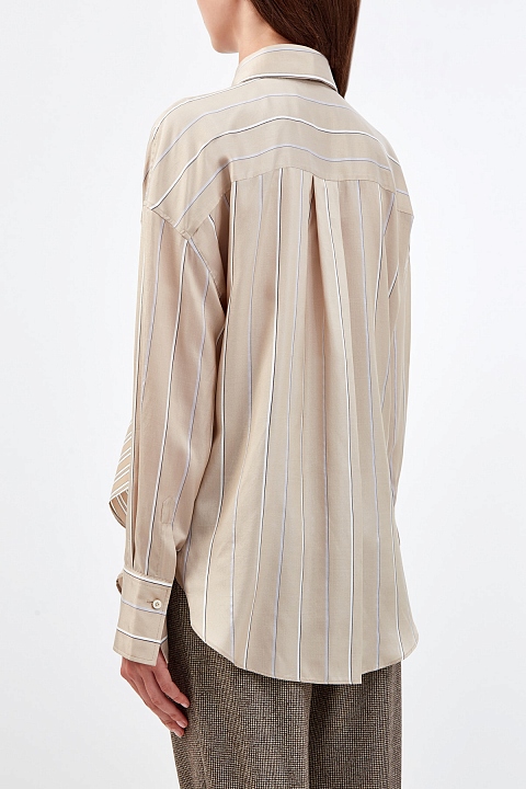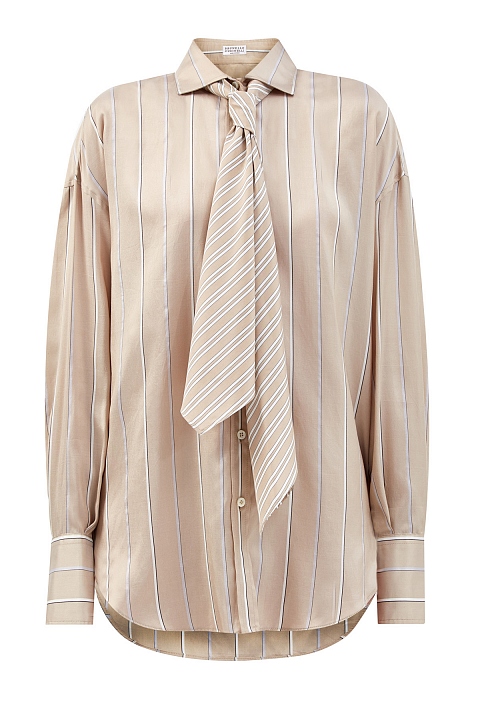Блуза-oversize от Brunello Cucinelli полностью выполнена из шелкового сатина. Благородный струящийся материал подчеркивает плавные линии кроя, а принт в полоску придает образу нотку неформального шика. Ворот дополнен лентой-галстуком, который можно снять или присоединить по желанию. Детали: широкие манжеты с перламутровой фурнитурой, закругленный нижний край, спущенная линия плеч. Сделано в Италии.