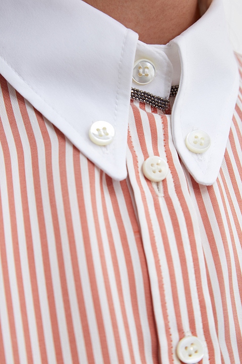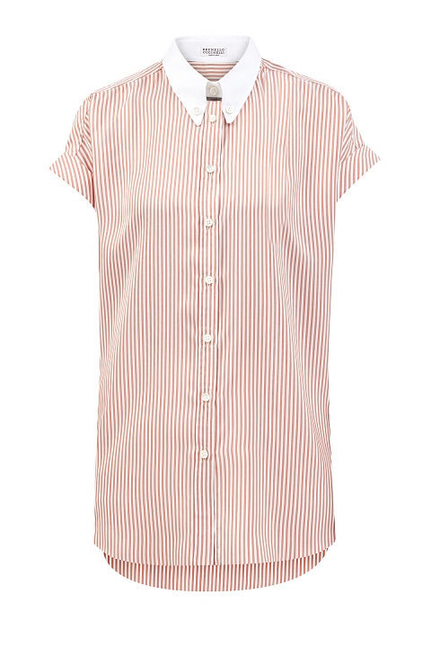 Блуза от Brunello Cucinelli выполнена из струящегося шелка — воздушная ткань смягчает строгие линии кроя и идеально подходит для летнего сезона. Принт в тонкую полоску в бело-розовой гамме дополнен контрастным воротником. Детали: асимметричный нижний край, застежка на пуговицы из перламутра, отвороты на рукавах, воротник button-down. Сделано в Италии.
