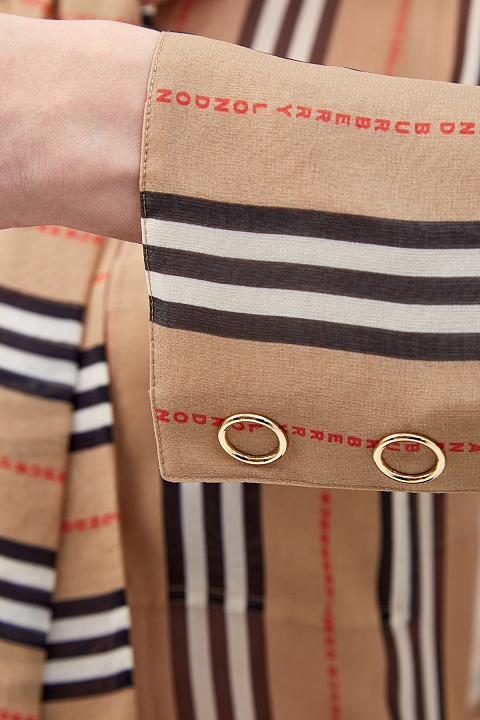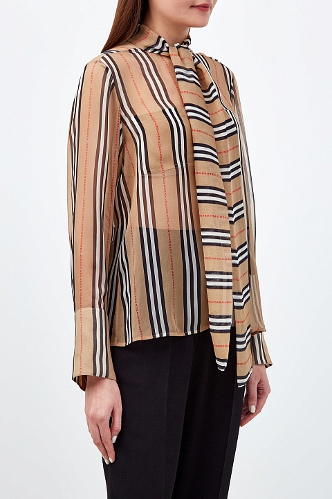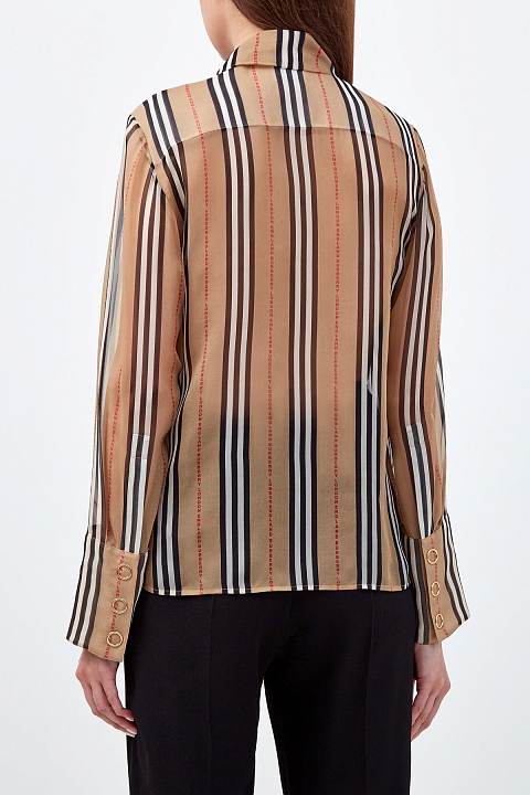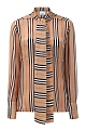 Элегантная блуза из натурального шелка от Burberry. Фирменный принт в полоску дополнен обновленным логотипом бренда. Линия застежки и манжеты с золотистым напылением на кнопках придают образу элегантность. Воротник-стойка продолжен лентами, которые можно оставить ниспадающими в стиле шарфа или завязать в объемный бант. Два нагрудных кармана завершают дизайн.