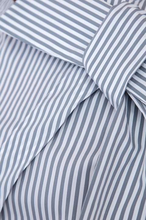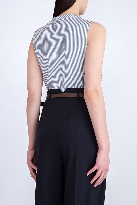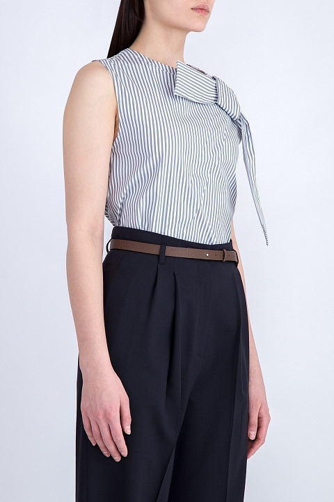 Изящная блузка Eleventy приталенного кроя, выполнена из хлопкового поплина с серо-белую полоску. Модель с открытыми проймами, округлым вырезом горловины, украшенным объемным бантом и декоративной планкой на передней панели, расположенной по косой.