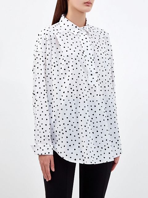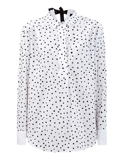 Базовая белая блуза от Ermanno Ermanno Scervino выполнена из хлопкового поплина — эластичной, держащей форму ткани. Фактурный акцент — принт в виде сердец, который вносит в образ фирменную легкость. Отложной воротник дополнен лентами на спинке, а также застежкой спереди. Объемный, расслабленный крой подчеркнут спущенной линией плеч и заложенными складками. Сделано в Италии.