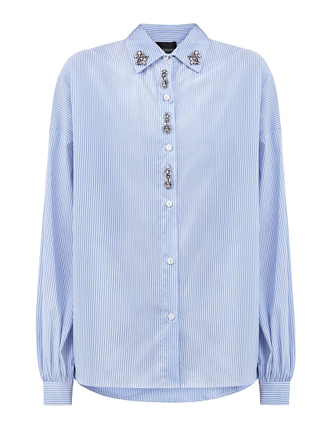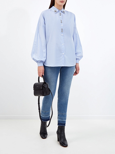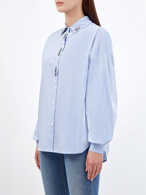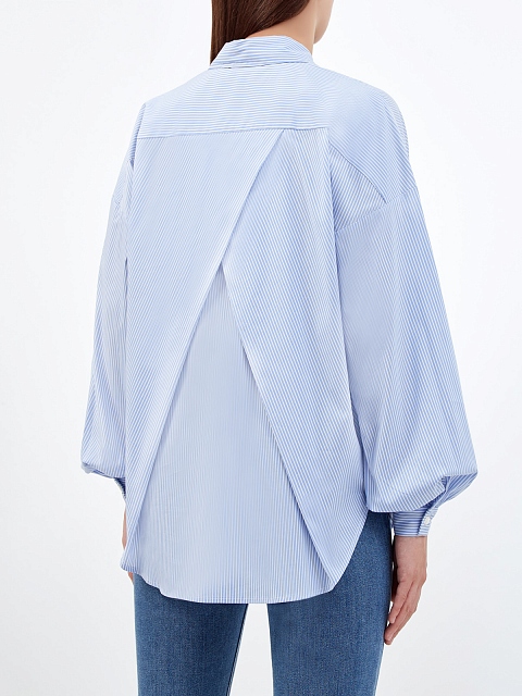 Классическая блуза в полоску от Ermanno Ermanno Scervino выполнена из хлопкового поплина — эластичной, держащей форму ткани. Сверкающий штрих в фирменном стиле — инкрустированные кристаллами элементы. Архитектурный крой подчеркивают объемные рукава и асимметричные заложенные складки на спинке изделия. Детали: застежка на пуговицы, отложной воротник. Сделано в Италии.