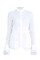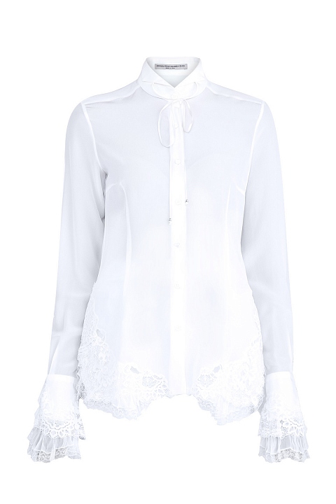 Изящная женская блузка Ermanno Scervino приталенного кроя, выполненная из шелка белого цвета с кружевными вставками на нижней кромке и манжетах рукавов. Модель с застежкой на пуговицы дополняет конструктивный отложной воротник Windsor с завязками. Сделано в Италии.