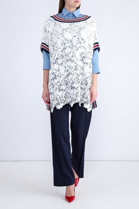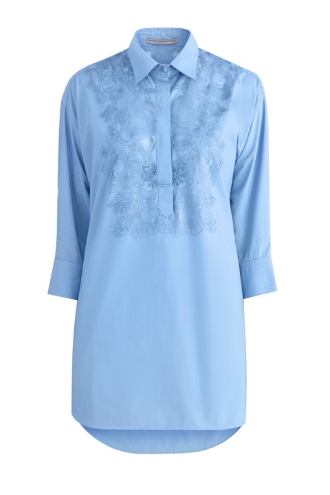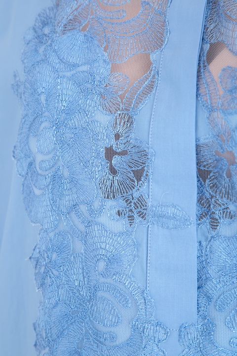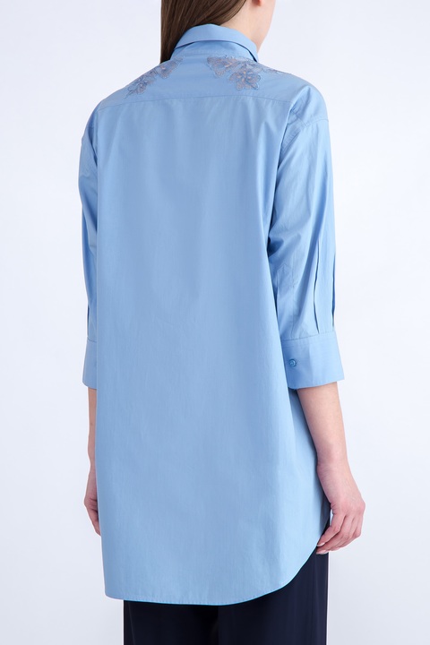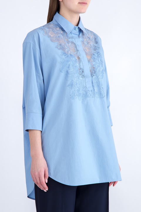 Лаконичная женская блузка кроя oversize из весенне-летней коллекции Ermanno Scervino создана из комфортного хлопка в нежном васильковом оттенке. Модель с отложным воротником декорирована кружевом с цветочным мотивом по передней планке вдоль линии пуговиц и на кокетке спинки. Нежный цветочный узор создает игру на контрастах с расслабленным силуэтом, удлиненной нижней кромкой и спущенной линией плеча. Изделие с отложным воротником и рукавами длиной ¾, завершенными манжетами. Сделано в Италии.