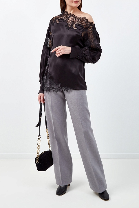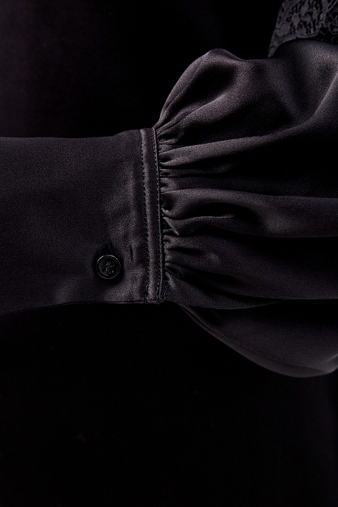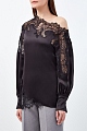 Блуза прямого кроя от Ermanno Scervino полностью выполнена из шелкового атласа. Вставки из кружева ручной работы — ключевой элемент ДНК Модного дома. Однотонный черный цвет подчеркивает блестящую фактуру материала. Пышные цельнокроеные рукава с высокими манжетами придают образу нотку аристократического шика. Детали: открытая линия плеч, асимметричный нижний край. Сделано в Италии.
