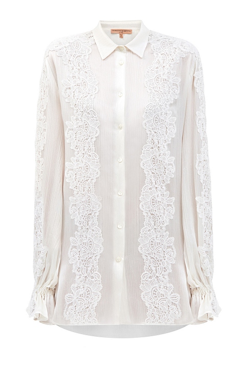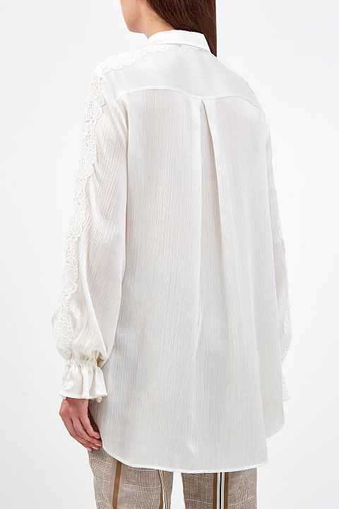 Воздушная блуза из эксклюзивной линии Life от Ermanno Scervino выполнена из невесомого шифона на основе хлопка и шелка. Легкий материал в оттенке перламутра с полностью натуральным составом идеально подходит для создания летних аутфитов. Объемные рукава с эластичными вставками на манжетах подчеркивают расслабленный стиль изделия, а кружевной декор ручной работы придает образу романтический штрих. Детали: застежка на пуговицы на передней планке, отложной воротник, свободный крой.