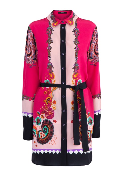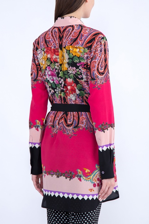 Яркая удлиненная блузка Etro создана из нежного шелка яркого оттенка с мотивом пейсли по всему полотну. Модель приталенного силуэта, образованного пояском на линии талии, дополнена центральной планкой на фирменных пуговицах и широкими манжетами на длинных втачных рукавах. Сделано в Италии.