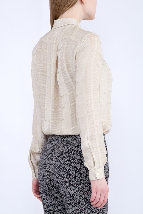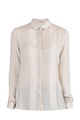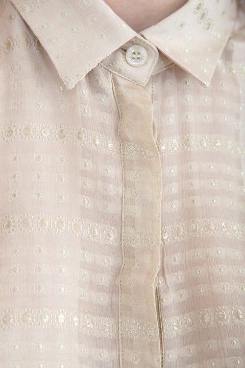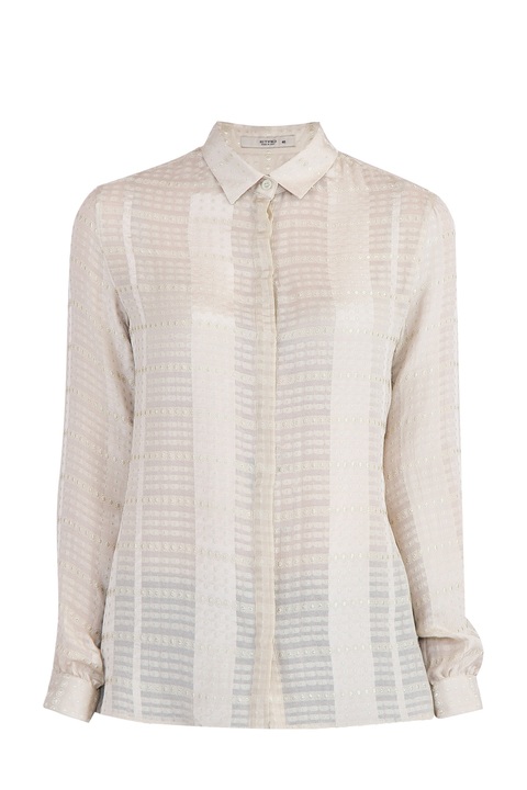 Изящная женская блузка Etro прямого кроя выполнена из мягкого шелка кремового оттенка с отложным воротником-стойкой и длинными рукавами с плотными манжетами. Особенностью модели является повторяющиеся по всему полотну фактурные аппликации. Сделано в Италии.
