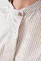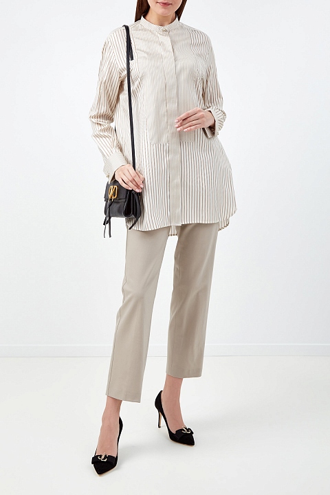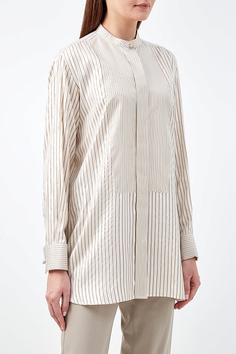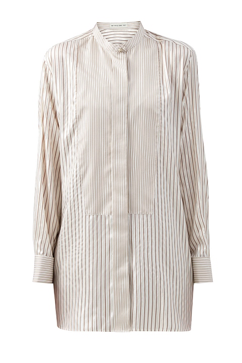 Элегантная oversize-блуза от Etro полностью выполнена из шелка. Принт в тонкую полоску дополнен мерцающей золотистой нитью люрекса. Расслабленный крой контрастирует с аристократичной отделкой: воротником-стойкой и манжетами под запонки с оригинальной фурнитурой. Детали: потайная застежка на пуговицы, закругленные нижние кромки. Сделано в Италии.