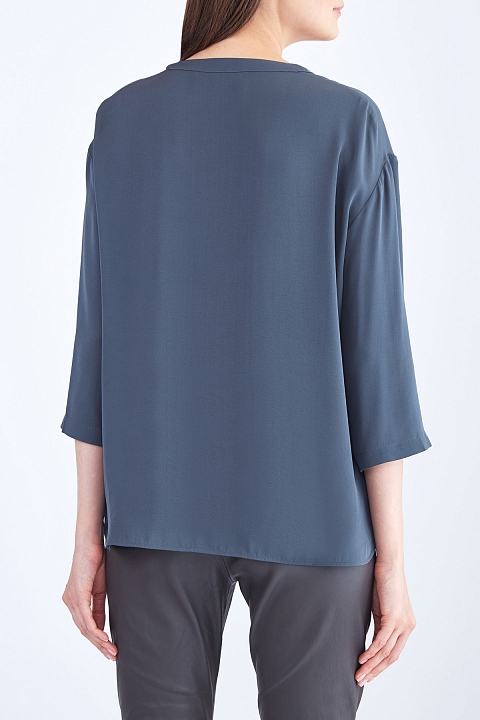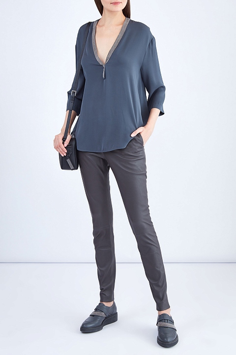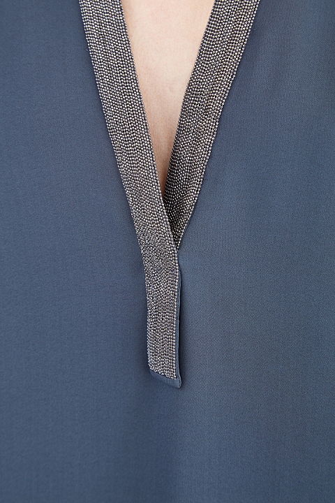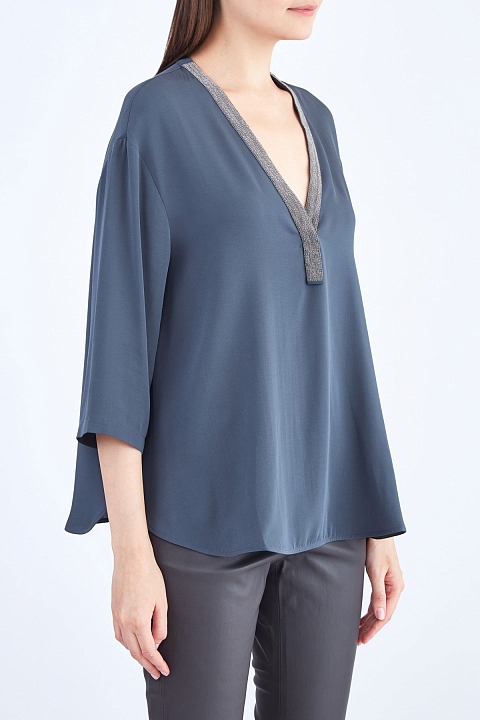 Лаконичная женская блуза слегка расклешенного кроя из коллекции осень-зима от Fabiana Filippi выполнена из струящегося шелка серо-голубого оттенка. Модель с глубоким V-образным вырезом декольте, обрамленным мерцающими цепочками бусин ювелирной огранки. Фирменный расслабленный стиль формируют спущенная линия плеча и рукав длины ¾. Сделано в Италии.