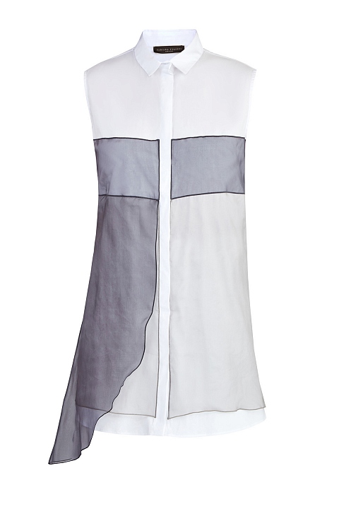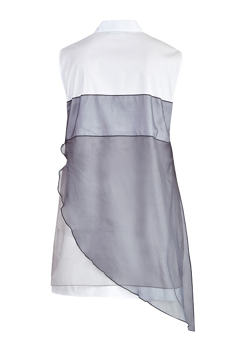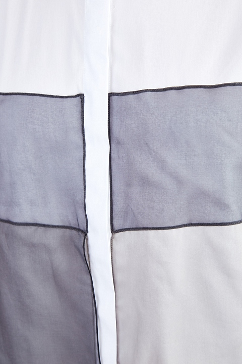 Блуза слегка приталенного силуэта от Fabiana Filippi выполнена из хлопкового поплина белоснежного цвета. Особенностью модели стала отделка планок в стиле colorblock шелковой органзой оттенка графита, а также нашитый поверх асимметричный воздушный кейп. Детали: отложной воротник, потайная застежка на пуговицы. Сделано в Италии.