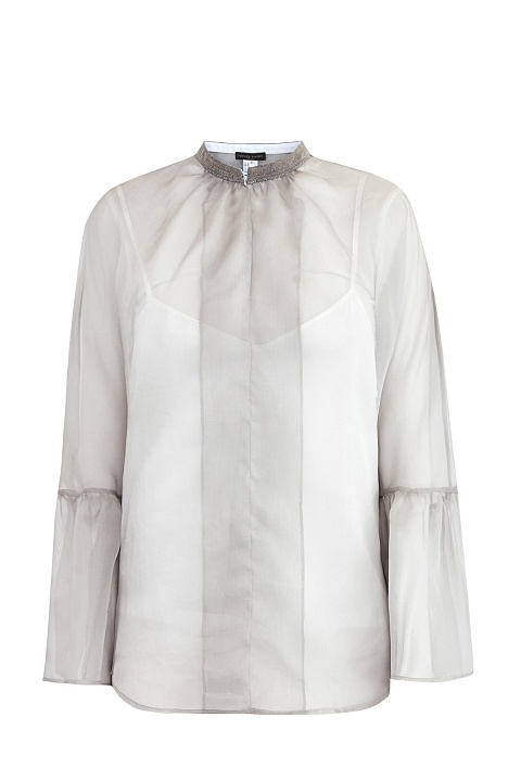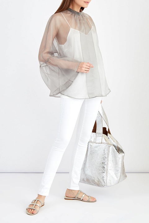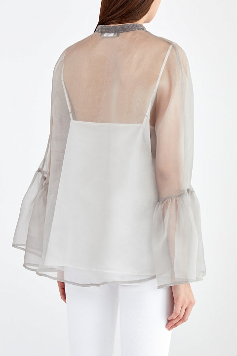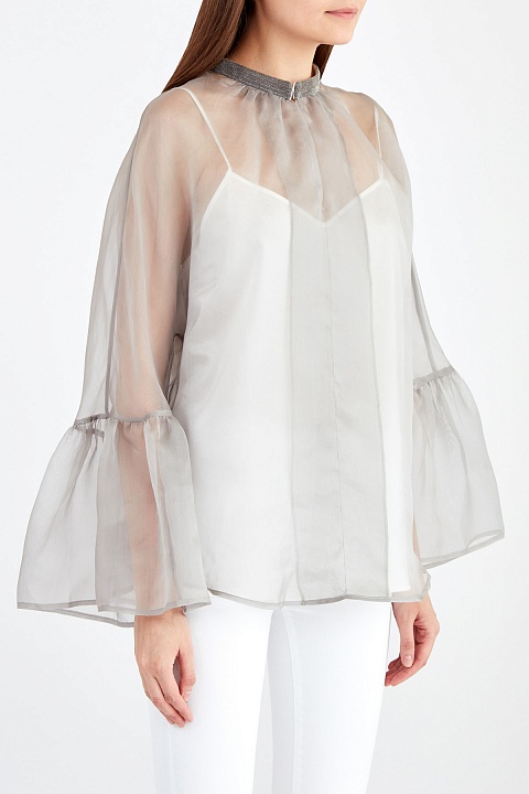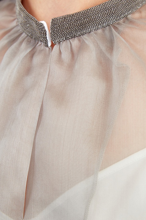 Легкий комплект Fabiana Filippi, состоящий из топа и прозрачной верхней блузы. Летящий фасон оформлен воротником-стойкой, который расшит мерцающими бусинами. Декор ручной работы дополнен объемными оборками, которые делают блузу более воздушной, а белоснежный атласный топ на тонких бретелях подчеркивает силуэт. Сделано в Италии.