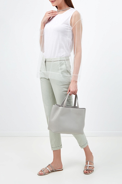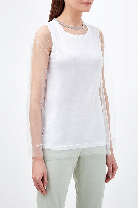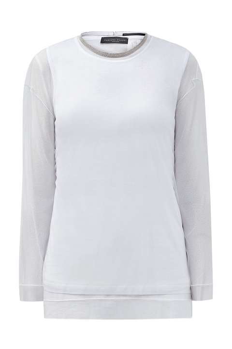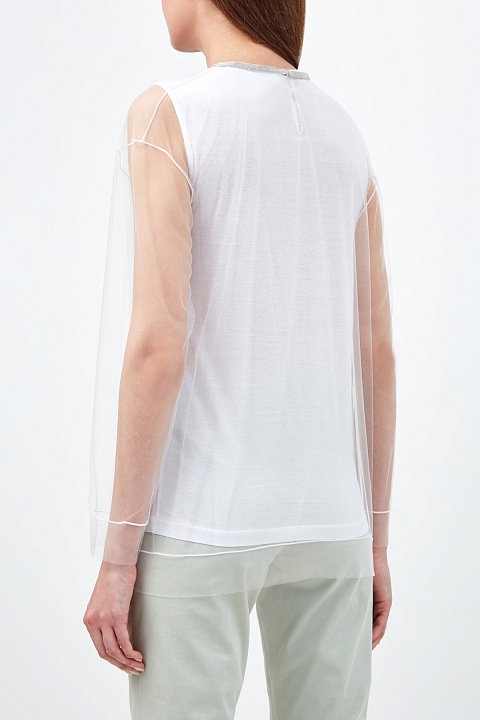 Топ 2 в 1 от Fabiana Filippi выполнен в стиле спортшик. Модель из мягкого хлопка джерси в универсальном белом цвете дополнена съемной блузой из полупрозрачной вуали. Круглая пройма горловины вручную расшита мерцающими бусинами ювелирной огранки. Детали: длинные рукава на спущенной линии плеч, застежка на спинке. Сделано в Италии.
