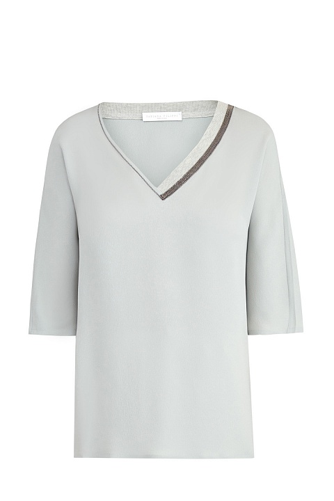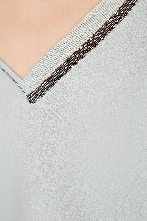 Женская блуза из шелка от Fabiana Filippi полностью создан из фактурного марокканского шелка в пепельно-сером оттенке. Оригинальный образ создает V-образный вырез декольте с вязаной отделкой в рубчик и выполненной вручную вышивкой цепочками ювелирной огранки. Детали: короткие цельнокроеные рукава, свободный, не стесняющий движений крой. Сделано в Италии.