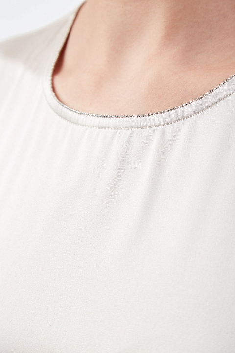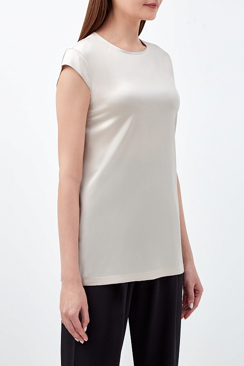 Атласный топ от Fabiana Filippi создан из натурального шелка в жемчужно-бежевом оттенке. Свободный струящийся силуэт и короткие рукава делают модель универсальным элементом базового гардероба. Круглая пройма горловины расшита цепью мерцающих бусин в фирменном стиле. Потайная застежка на спинке завершает дизайн. Сделано в Италии.