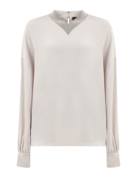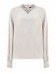 Элегантная женская блуза от Fabiana Filippi выполнена из струящегося атласного шелка, волокна ацетата в составе облегчают уход за изделием. Гладкий материал в кремовом оттенке с деликатным блеском идеально подходит для создания деловых и торжественных образов. Изысканный штрих в образ вносят ювелирные цепочки вдоль V-образного выреза.