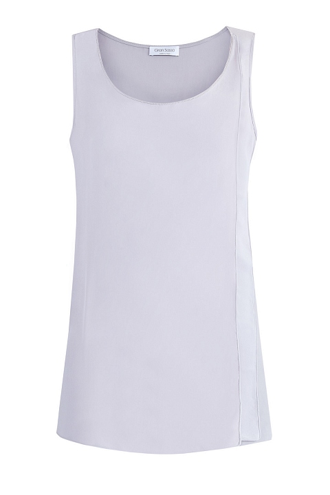 Лаконичный топ прямого расслабленного силуэта от Gran Sasso создан из воздушной шелковой ткани пастельного серо-фиолетового оттенка. Передняя планка дополнена деталями с эффектом наслоения и круглым вырезом декольте с выполненной вручную отделкой сверкающей цепью ювелирной огранки. Детали: модель без рукавов, широкие бретели. Сделано в Италии.