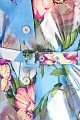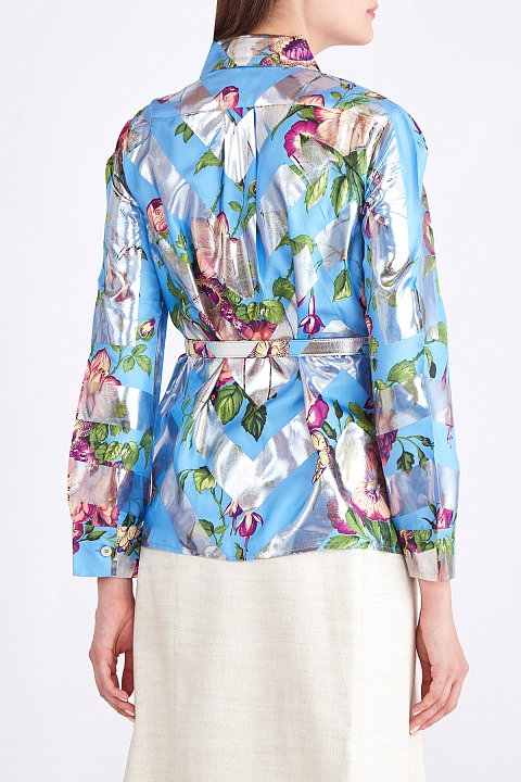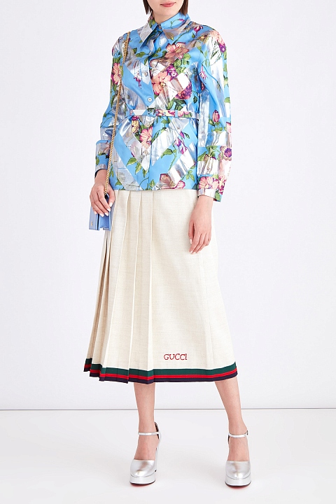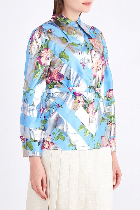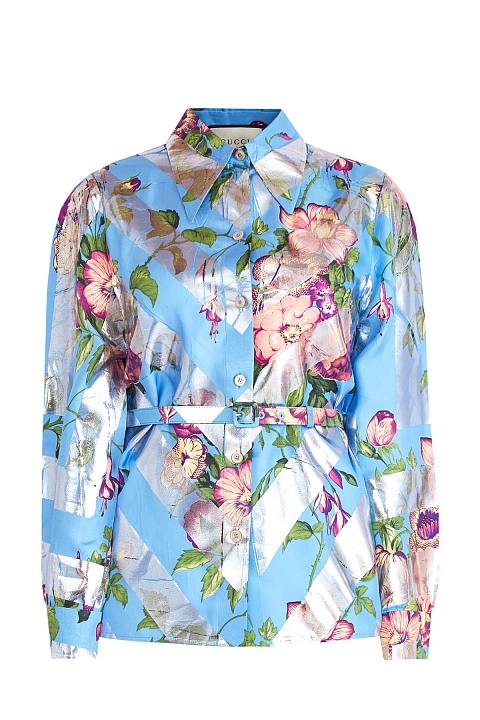 Яркая женская блуза из весенне-летней коллекции Gucci выполнена в голубом цвета и украшена цветочным орнаментом в сочетании с серебристыми печатными полосами, образующими геометрический орнамент, который сохраняет симметрию на рукавах. Элементы расслабленного образа, такие как прямой крой и свободные рукава уравновешивают отложной итальянский ворот и ремешок с пряжкой на талии. Сделано в Италии.