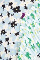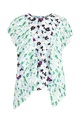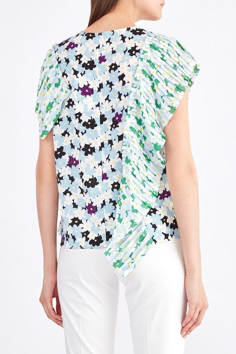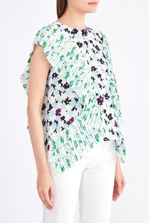 Яркая блузка из весенне-летней коллекции Kenzo приталенного кроя из легкой матовой ткани со сплошным цветочным узором Allover в фиолетово-голубой гамме. Модель с круглым воротом и открытыми проймами. Женственный стиль подчеркивают легкие плиссированные оборки зеленоватого тона, расположенные ассиметрично.