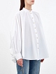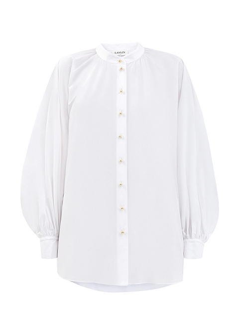 Элегантная блуза от Lanvin создана из тонкого хлопкового поплина. Модель в белоснежном оттенке дополнена свободными архитектурными рукавами и французскими манжетами. Застежка на ряд фигурных пуговиц подчеркивает изысканный стиль, вдохновленный культовым флаконом парфюма Arpège.
