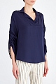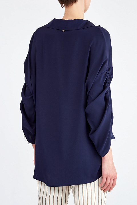 Лаконичная блуза из линии Hayot от Lorena Antoniazzi выполнена из чистого шелка в глубоком сапфировом оттенке с атласной внутренней поверхностью. Элегантность образу придает присборенная отделка на рукавах с завершающей деталью в виде мерцающих кристаллов на подвесках. Детали: закругленные нижние кромки, V-образная пройма горловины с отложным воротником, спущенная линия плеч, фирменная подвеска на спинке. Сделано в Италии.