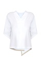 Эффектная блуза свободного кроя от Lorena Antoniazzi выполнена из плотного хлопкового поплина белоснежного тона. Модель сложного кроя на запах дополнена оригинальными рукавами и низом с асимметричными кромками, а также внутренней отделкой широкой тесьмой из грогрена бежевого оттенка. Детали: спинка с нахлестом на застежке-пуговице, V-образная пройма горловины. Сделано в Италии.