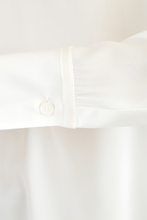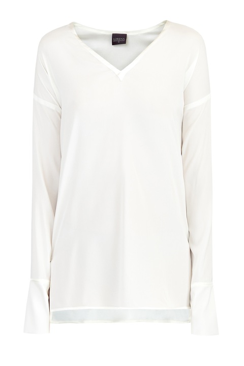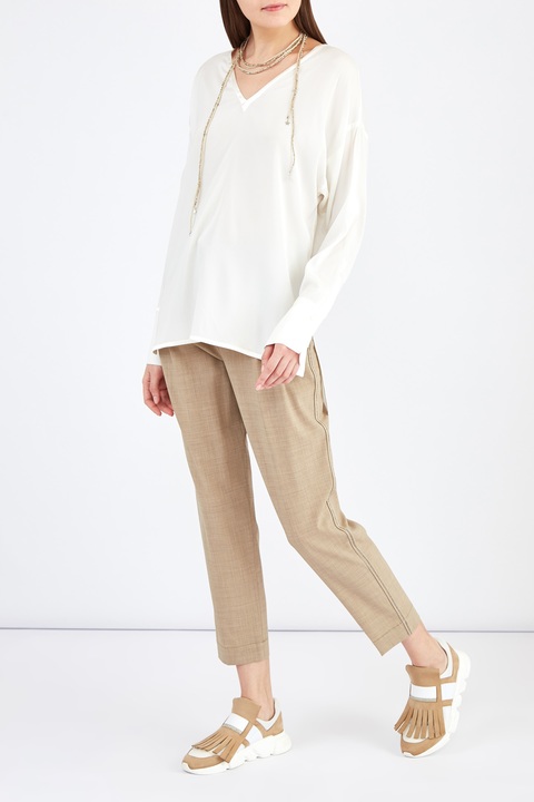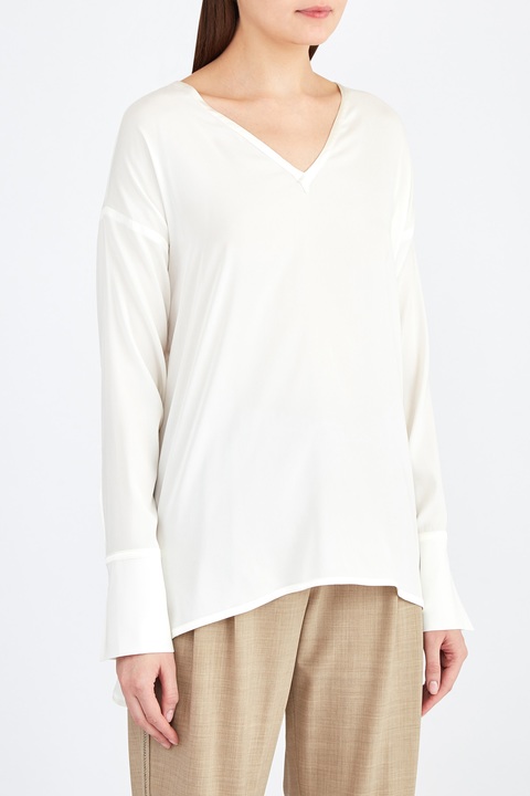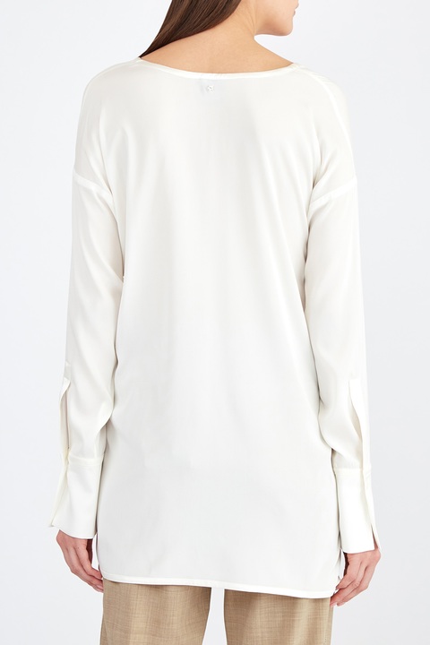 Лаконичная блуза от Lorena Antoniazzi выполнена из воздушного шелка в молочно-белом оттенке. Фирменный стиль подчеркивают минималистичные акценты в виде атласных полос по кромкам и манжетам, а также миниатюрная деталь в виде звезды на спинке. Детали: асимметричные нижние кромки с боковыми разрезами, V-образная пройма горловины, спущенная линия плеч, манжеты в строгом стиле. Сделано в Италии.