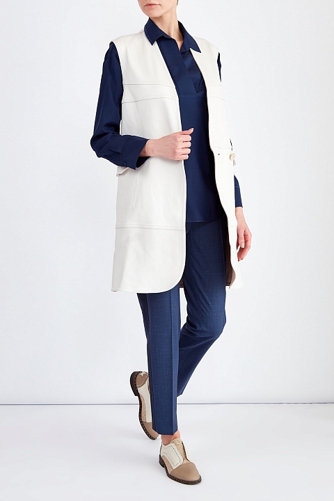 Лаконичная блуза от Lorena Antoniazzi выполнена из чистого шелка в глубоком сапфировом оттенке с мягким жемчужным блеском по поверхности. Фирменный стиль подчеркивают минималистичные акценты в виде атласных полос по кромкам и манжетам, а также миниатюрная деталь в виде звезды на спинке. Детали: асимметричные нижние кромки, V-образная пройма горловины, спущенная линия плеч, манжеты в строгом стиле. Сделано в Италии.