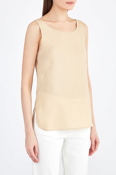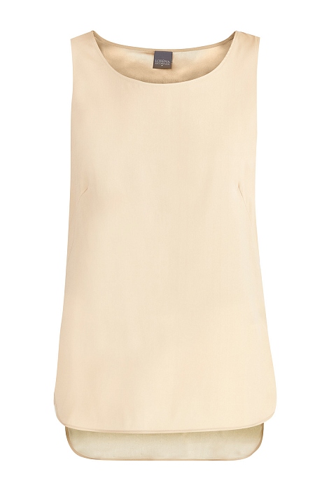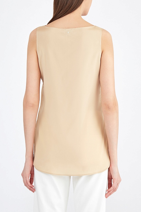 Базовый топ свободного кроя от Lorena Antoniazzi создан из чистого шелка в классическом бежевом цвете с благородным жемчужным блеском по поверхности. Фирменный стиль подчеркивает миниатюрная деталь в виде звезды на спинке. Детали: асимметричные нижние кромки, широкие бретели, вытачки для посадки по фигуре. Сделано в Италии.