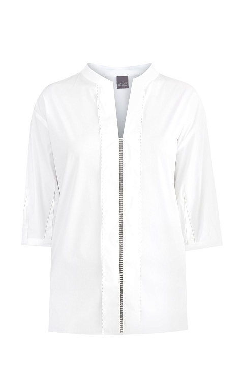 Стильная женская блуза прямого кроя от Lorena Antoniazzi выполнена из хлопка белого цвета. Модель дополнена контрастной прострочкой нитью песочного оттенка по рукавам длины ¾, а также оригинальным швом, соединяющим передние планки. Детали: ворот-стойка, спущенная линия плеча, фирменный элемент в виде звезды на спинке. Сделано в Италии.