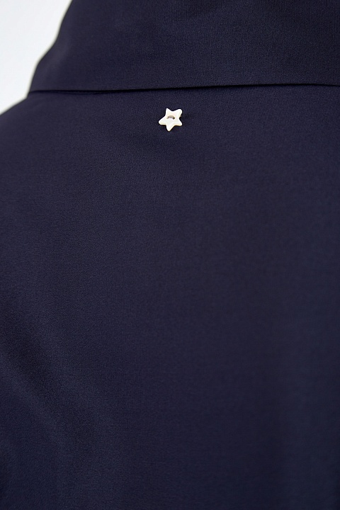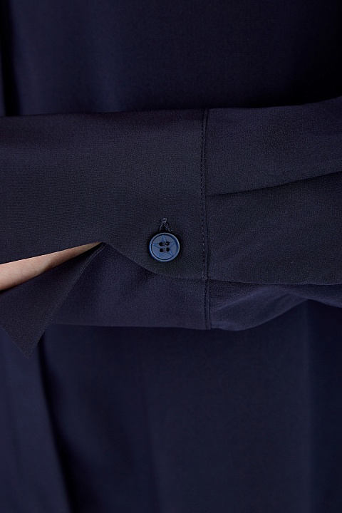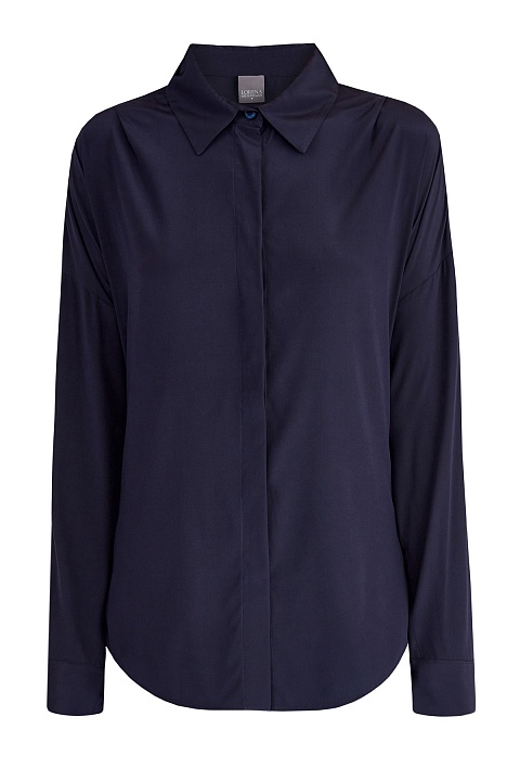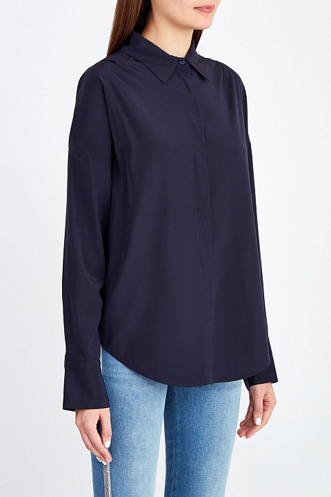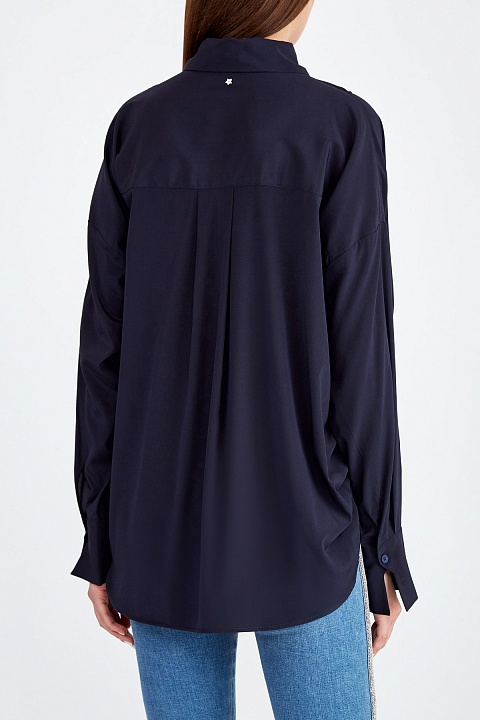 Блуза Lorena Antoniazzi создана из тонкой шелковой нити глубокого синего цвета. Модель дополнена аккуратным французским воротником. Благородные свойства натурального волокна позволяет ткани струиться по фигуре, создавая световые переливы. Силуэт oversize оформлен плотными манжетами и дополнительной планкой, которая скрывает потайную застежку на пуговицы. Детали: спущенная линия плеч, фурнитура с перламутровым сиянием, символика бренда на спинке. Сделано в Италии.