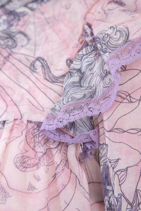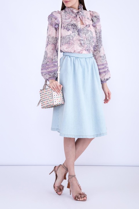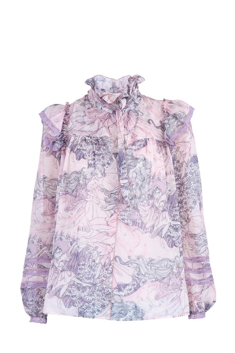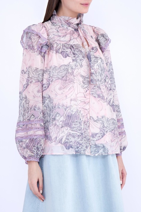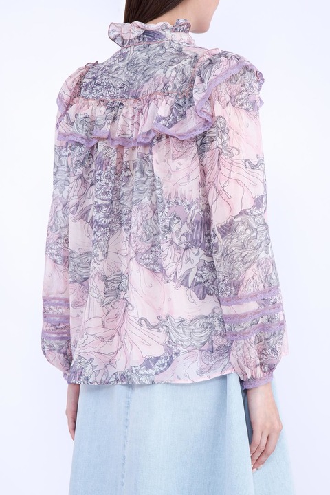 Эффектная женская блузка Marc Jacobs трапециевидного кроя, выполненная из полупрозрачного хлопка с фирменными узорами в розовой гамме. Модель характеризуется длинными рукавами-баллонами, воротом стойкой и внутренним шелковым топом. Особенностью изделия являются рюши с мягкими волнами и кружевом, украшающие спинку, плечи и ворот.