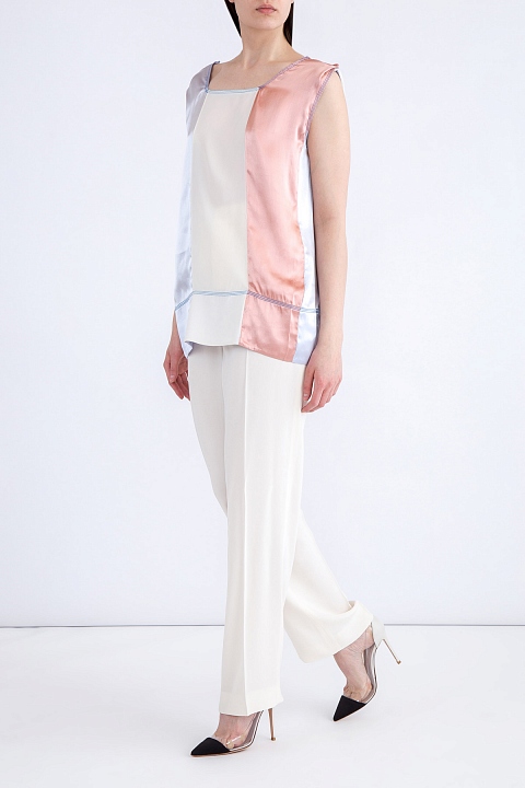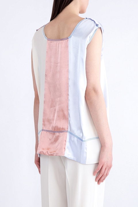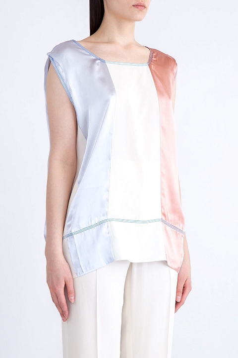 Блузка без рукавов из струящейся атласной ткани с контрастной строчкой