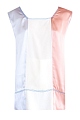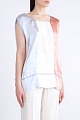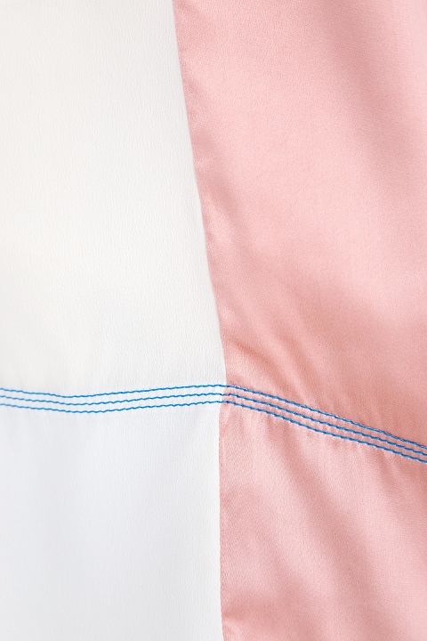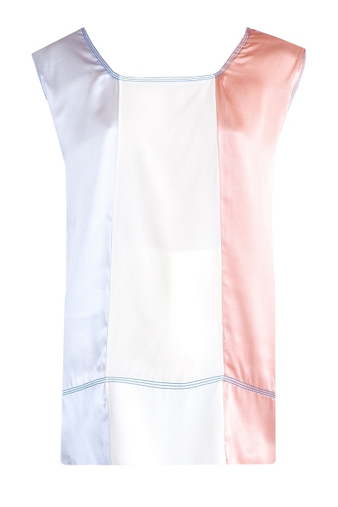 Свободная удлиненная женская блуза из весенне-летней коллекции Marni выполнена из струящейся атласной ткани. Планки скроены из ткани трех оттенков: серо-голубого, жемчужно-белого и персиково-розового. Нежная цветовая гамма позволяет создать образ в романтическом стиле. Модель декорирована прострочкой яркими голубыми нитями по кромке выреза горловины, проймам рукавов и горизонтальной полосой вдоль подола изделия. Сделано в Италии.