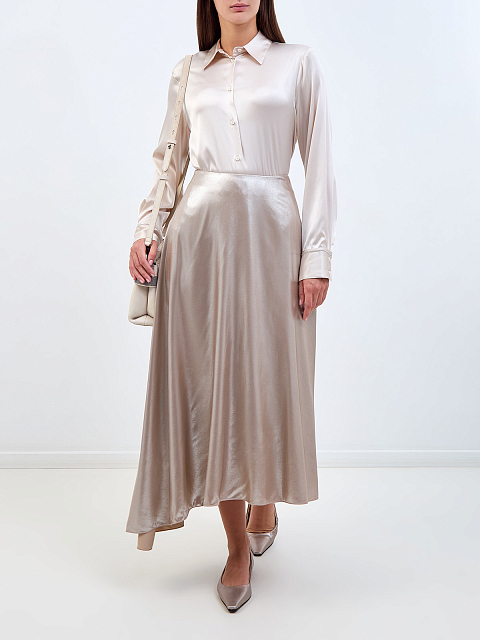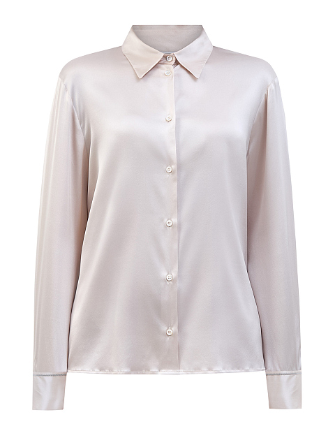Элегантная блуза в жемчужно-пудровом оттенке от Peserico. Модель создана из гладкого шелка с сатиновым блеском, струящийся материал идеально подходит для создания повседневных и вечерних образов. Женственный штрих — мерцающие ювелирные цепочки Punto Luce на манжетах. Детали: отложной ворот, застежка на пуговицы из перламутра. Сделано в Италии.