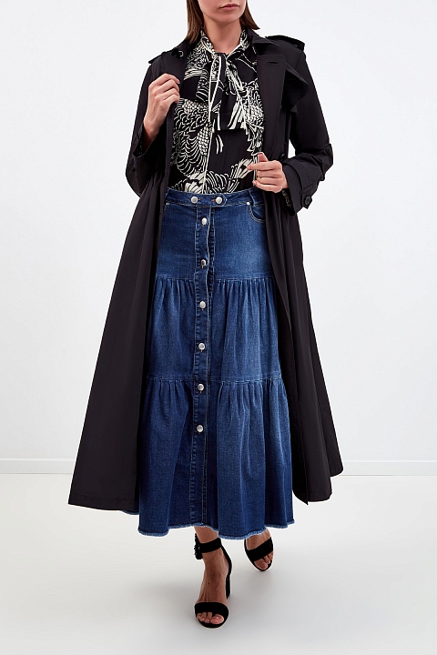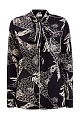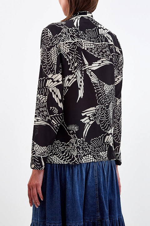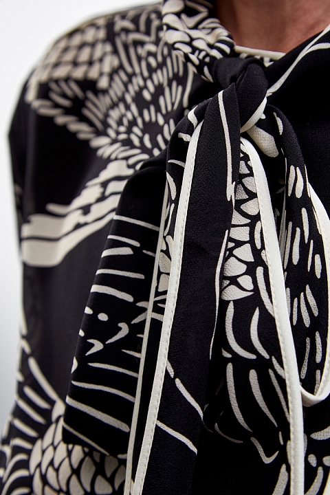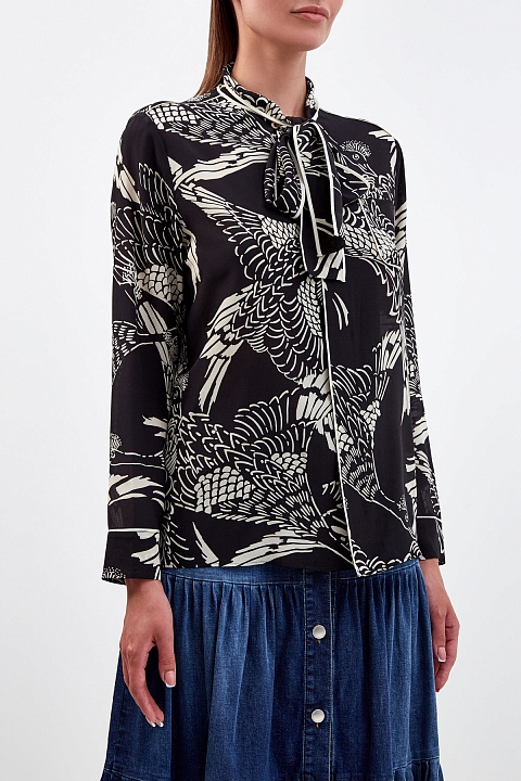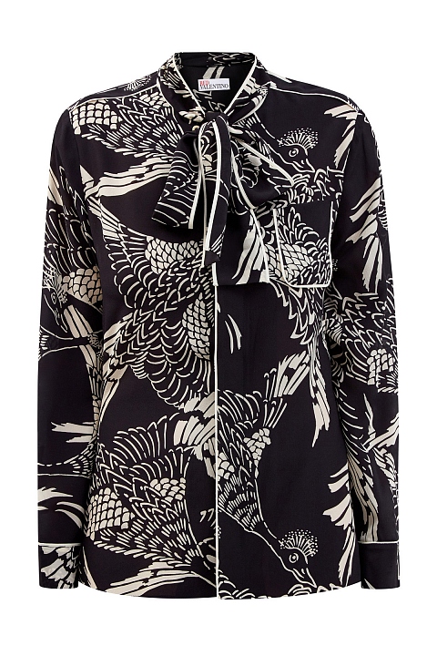 Легкая блуза в пижамном стиле от REDValentino выполнена из шелкового крепдешина в черном цвете. Гладкий струящийся материал дополнен эксклюзивным белым принтом Phoenix. Тонкий кант в цвет принта подчеркивает фирменный узор. Объемный бант на воротнике завершает дизайн. Детали: свободный крой, воротник-аскот, накладной карман, длинные рукава.