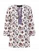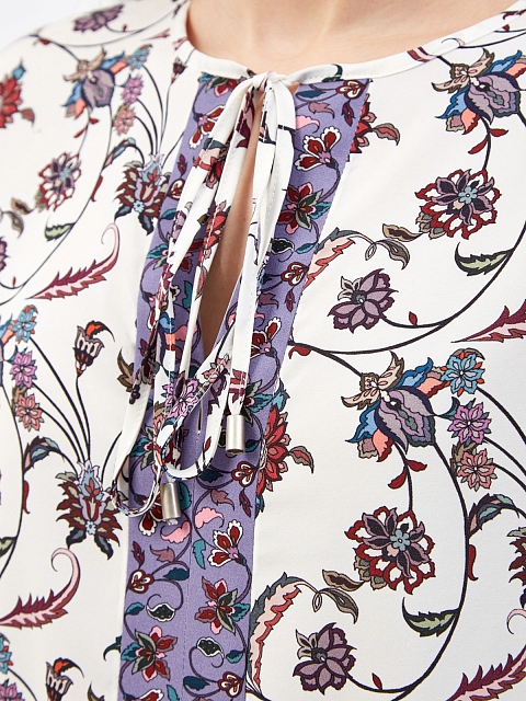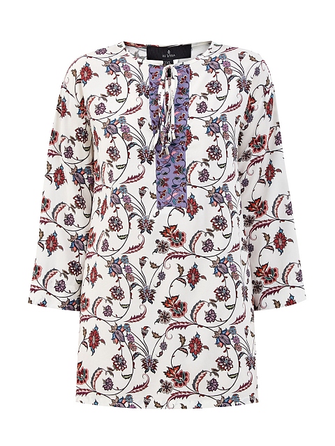 Блуза свободного кроя от Re Vera создана из гладкого струящегося шелка в молочном оттенке, эластичные волокна в составе облегчают уход за изделием. Флористический паттерн и ворот на кулиске вносят в образ расслабленный штрих. Детали: рукава ¾, круглый вырез горловины.