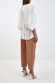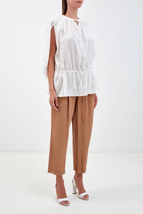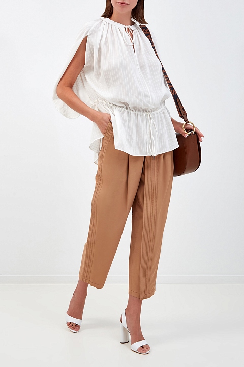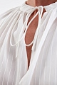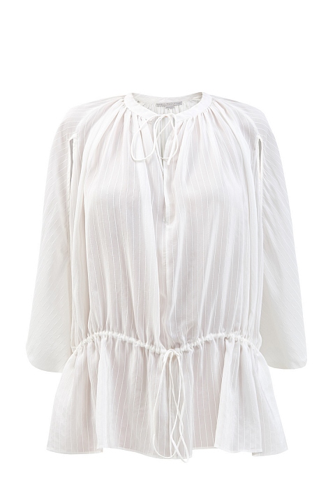 Воздушная блуза от Stella McCartney выполнена из тонкой и прочной вискозы с добавлением шелка в молочно-белом оттенке. Легкий дышащий материал с декоративной прострочкой идеально подходит для летнего сезона. Особенностью модели стал оригинальный свободный крой спинки, создающий эффект крыльев. Детали: пояс и воротник на регулируемых кулисках в тон, удлиненный нижний край.