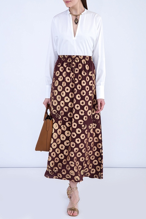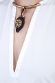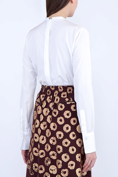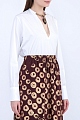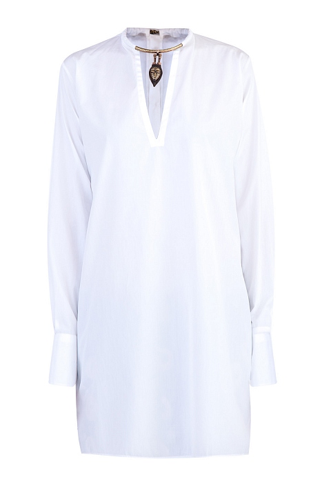 Лаконичная женская рубашка Valentino прямого кроя, выполненная из натурального хлопкового поплина белого цвета. Глубокой V-образный вырез горловины дополнен вшитым колье "Женщина-воин" с покрытием цвета античного золота. Длинные рукава завершаются широкими манжетами на пуговицах. Модель характеризуется разрезами по бокам. Сделано в Италии.