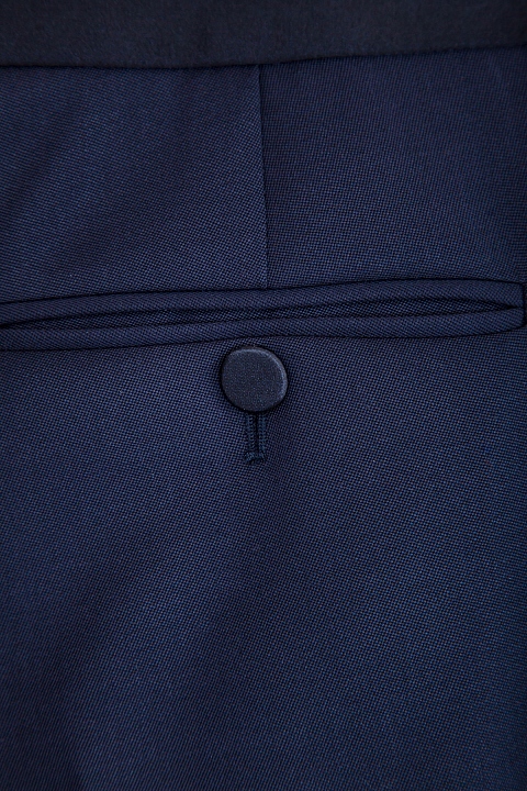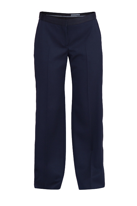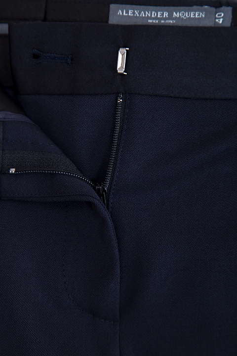 Классические женские брюки Alexander McQueen свободного кроя, расклешенные от бедра. Модель выполнена из плотной шерсти с матовой поверхностью темно-синего цвета. Особенностью изделия является отделка атласной тканью боковых швов, притачного пояса и пуговиц на задних карманах. Застежка осуществляется на молнию и крючок. Сделано в Италии.