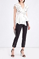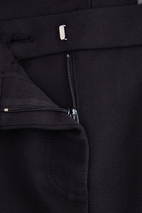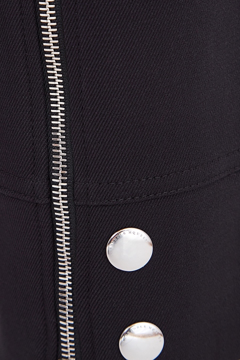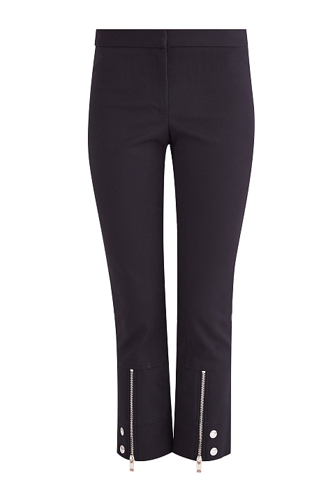 Эффектные брюки длины ⅞ сложного кроя из весенне-летней коллекции коллекции Alexander McQueen выполнены из эластичного хлопка глубокого черного тона, который оттенен фурнитурой серебристого оттенка. Модель в фирменном стиле деструктивизма декорирована молниями по центру передних планок и дополнена брендированными заклепками. Застежка на пуговицу, крючок и молнию завершает изделие. Сделано в Италии.
