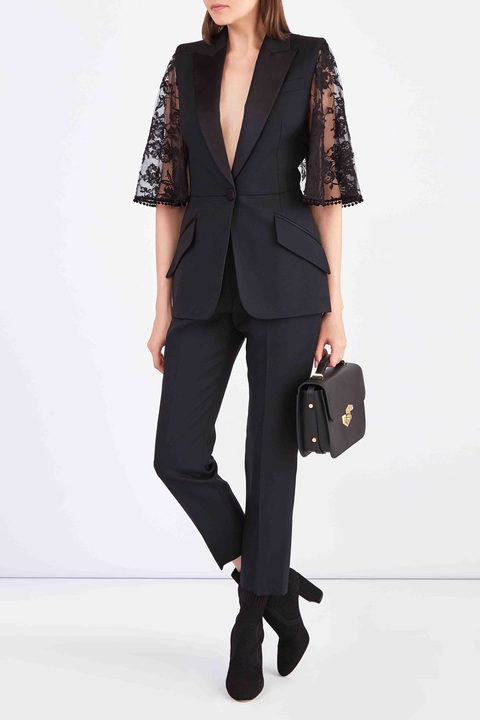 Минималистичные брюки прямого силуэта из коллекции осень-зима от Alexander McQueen выполнены из легкой шерстяной ткани с добавлением нити шелка для придания изделию мягкости и изысканного блеска по поверхности. Модель универсальной длины ⅞ дополнена притачным поясом для комфортной посадки по фигуре. Крой предусматривает вытачки для создания гармоничного силуэта, а также функциональные карманы. Сделано в Италии.