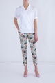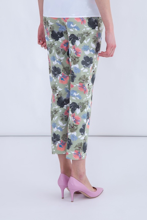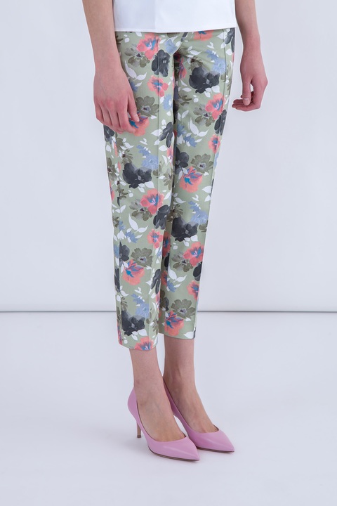 Изящные женские брюки-дудочки из коллекции Alexander Terekhov выполнены из эластичного хлопка пастельного зеленого оттенка и украшены акварельным узором в виде цветов голубого, розового и темно-серого оттенков. Укороченная модель, сужающаяся книзу, с двумя прорезными карманами по бокам. Застежка осуществляется на молнию и потайной крючок. Сделано в Италии.