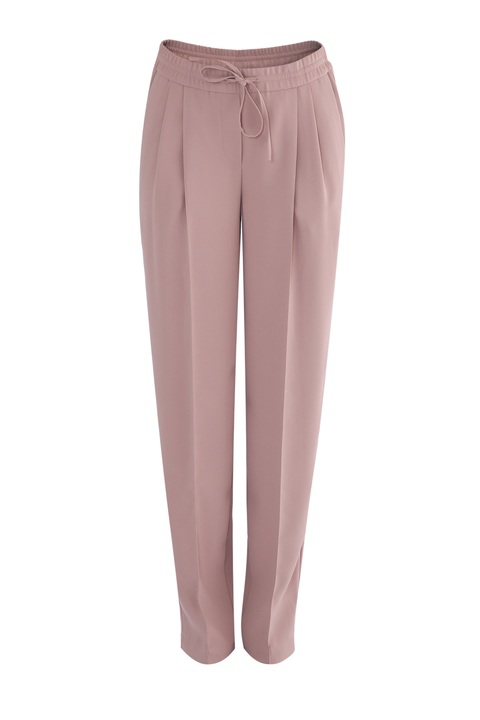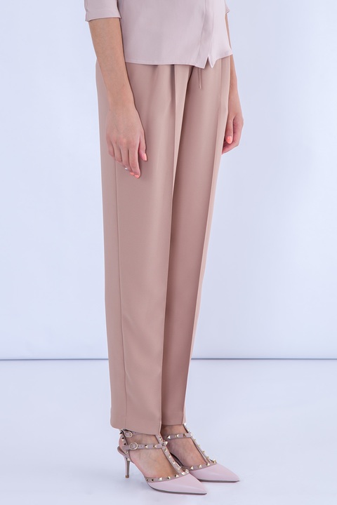 Лаконичные брюки Alexander Terekhov свободного кроя, слегка заужены у кромок и дополнены объемными выточками у эластичного пояса с регулировочным текстильным шнурком. Модель выполнена из легкой струящейся ткани с матовой поверхностью теплого бежевого оттенка. Фронтальные французские карманы создают дополнительный объем. Произведено в России.