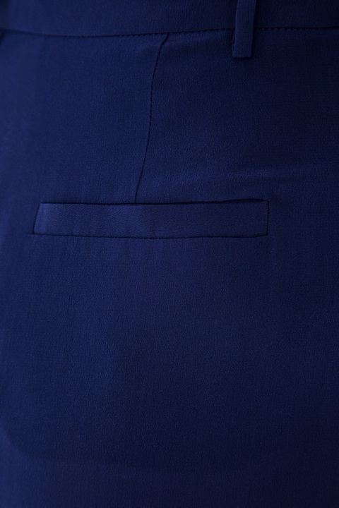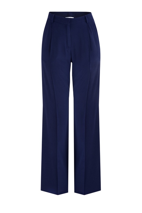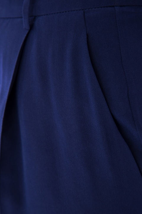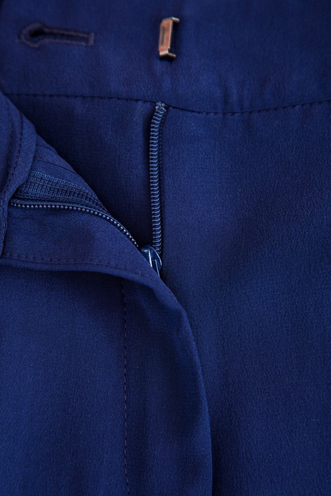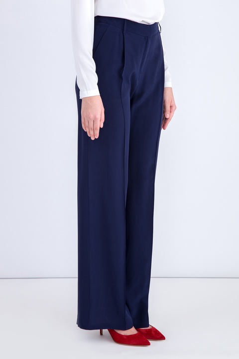 Эффектные женские брюки из коллекции бренда Alexander Terekhov широкого расклешенного кроя. Модель создана из струящегося шелка с матовой поверхностью темно-синего цвета. Изделие дополнено объемными складками спереди, французскими фронтальными и накладным задним карманами и конструктивными стрелками. Посадка осуществляется на завышенной линии талии на широком притачном поясе. Сделано в России.