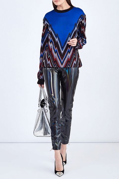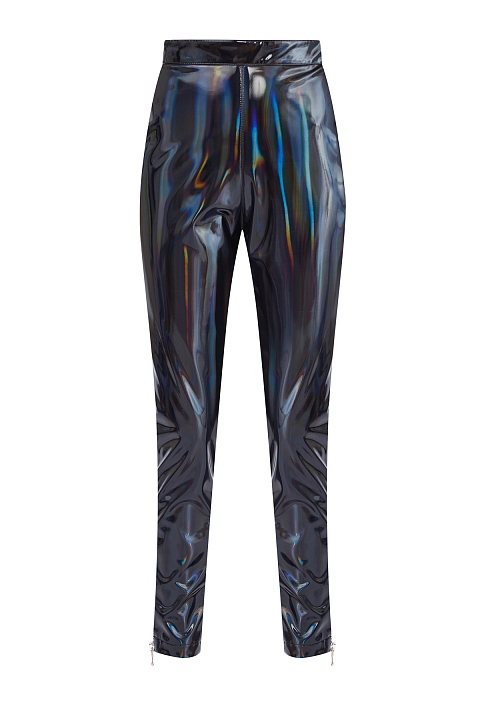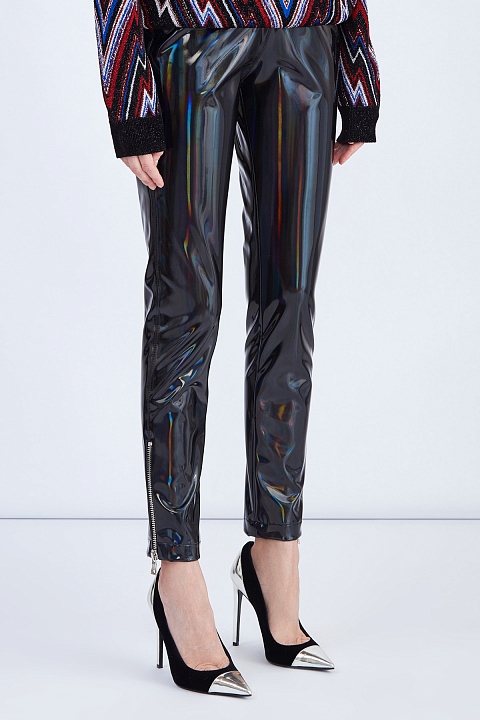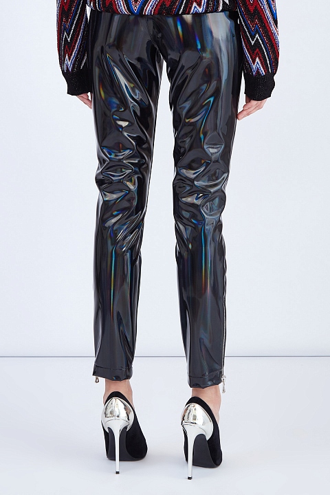 Эффектные брюки от Balmain созданы из плотной моделирующей силуэт ткани с голографическим покрытием оттенка металлик по всей поверхности, который придает образу футуристический акцент. Модель на притачном поясе дополнена потайной молнией в боковом шве, а также массивными застежками на лодыжках. Детали: облегающий крой скинни, объемные швы.